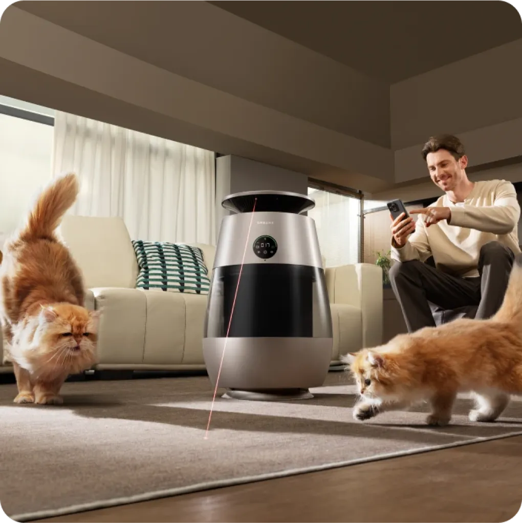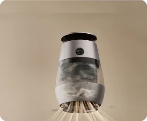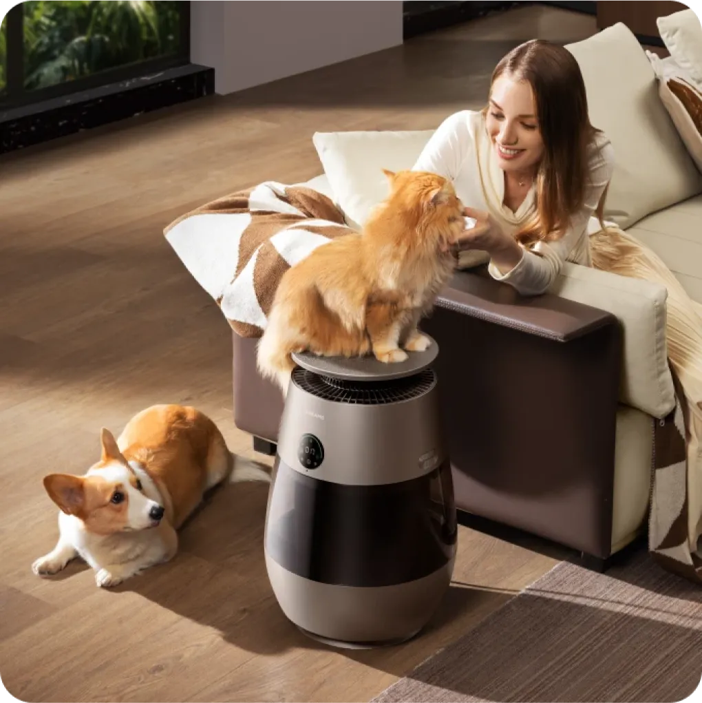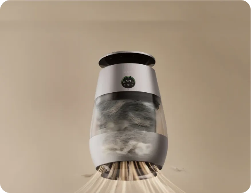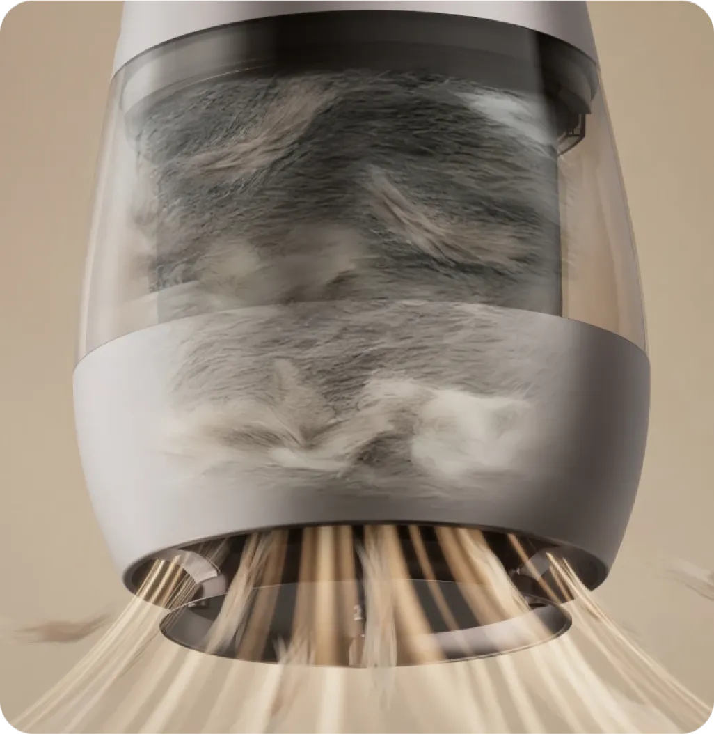 Dankzij de haaropvang op lange afstand*, automatische verzameling, krachtige reiniging en hoogfrequente circulatie kan het snel rondvliegend haar na het energieke spel van de kat of dagelijks uitvallend haar opvangen, waardoor 99,9% van het rondvliegende haar en de klitten onder meubels en in de kieren van de bank worden verwijderd.