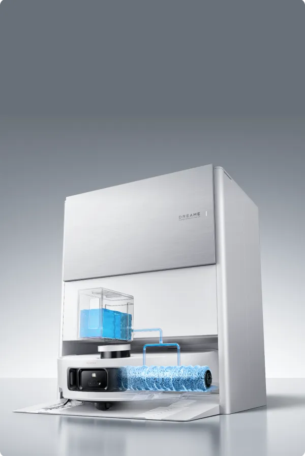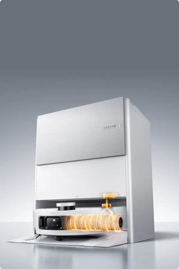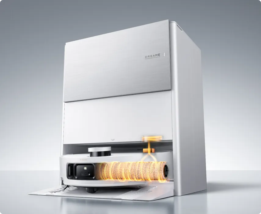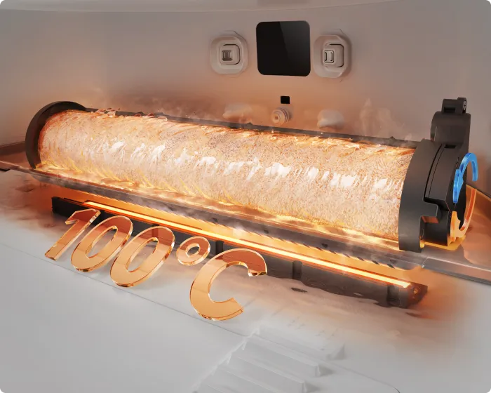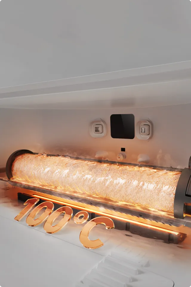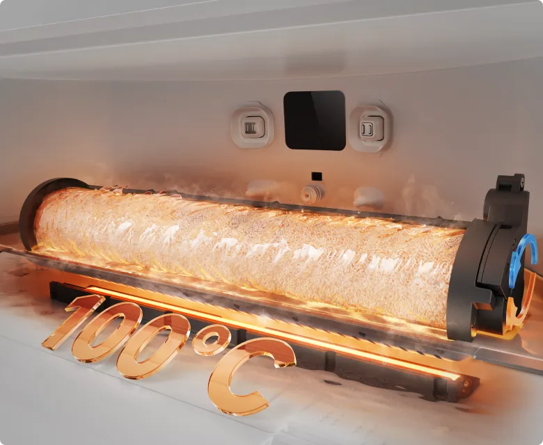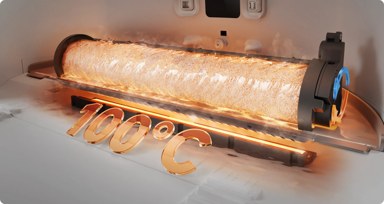 De stofzuiger geeft zichzelf na elke reinigingssessie een 'heet bad' dankzij de zelfreinigingstechnologie voor de ThermoHub™ Roller op 100 °C. De stofzuiger draait naar voren en naar achteren in het basisstation, verwijdert zware vlekken en neutraliseert geurtjes in de roldweil.
