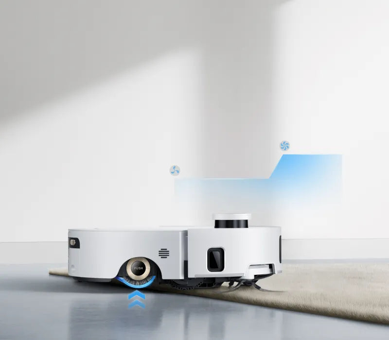 De dweilpad van de robotstofzuiger wordt opgetild om snel over tapijten heen te gaan en door te gaan met het schoonmaken van andere gebieden en ruimtes via de modus voor het oversteken van tapijten.