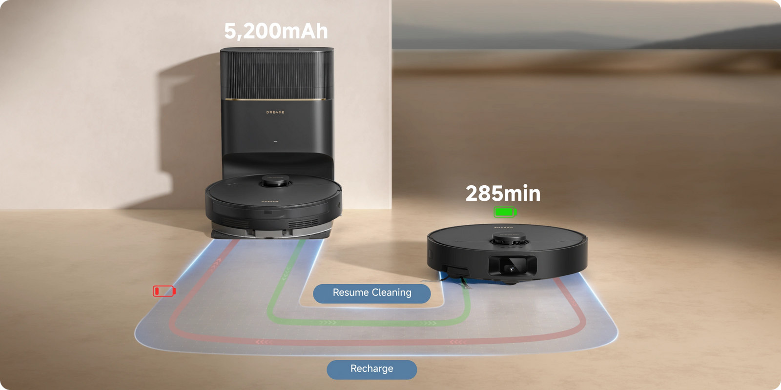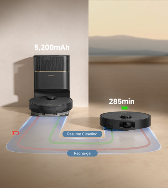 *285 min: Gebaseerd op onze interne laboratoriumgegevens in de modus Stofzuigen en dweilen. Werkelijke prestaties kunnen hiervan afwijken.