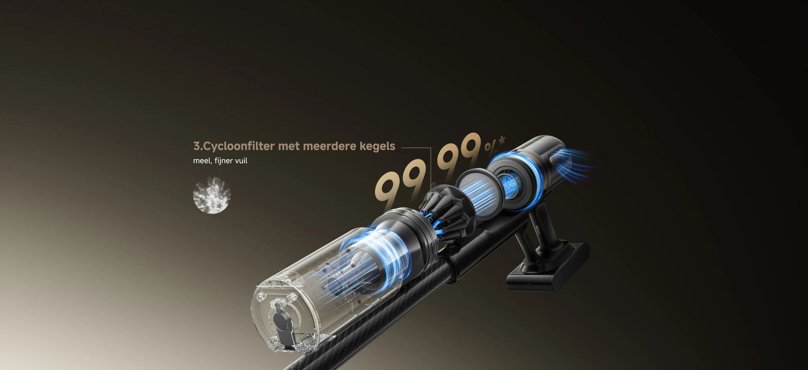 *90 minuten: gebaseerd op tests in Dreame Lab, in de Eco-modus met de combinatiehulpstuk.