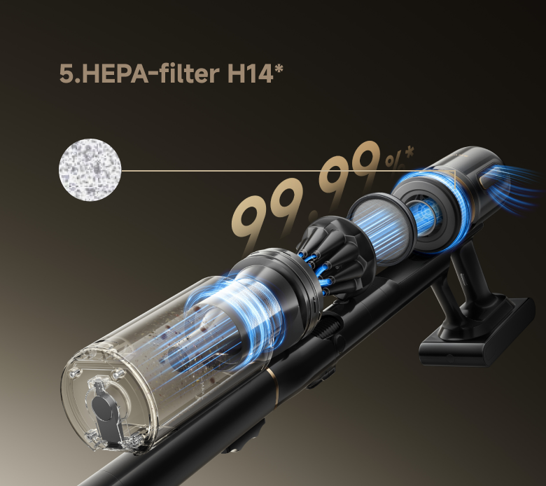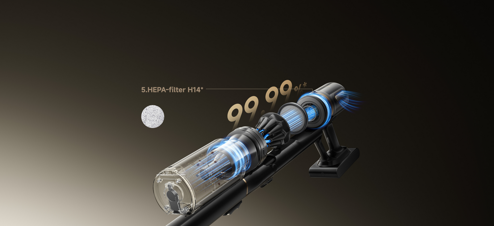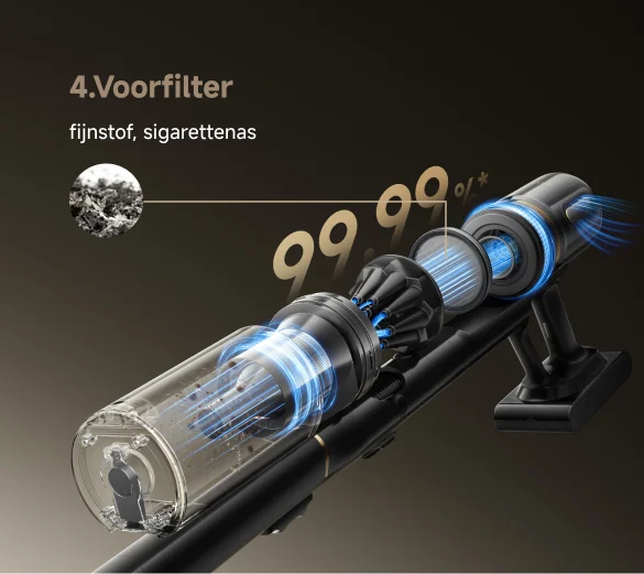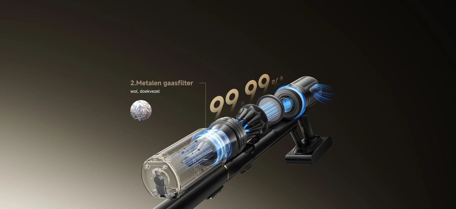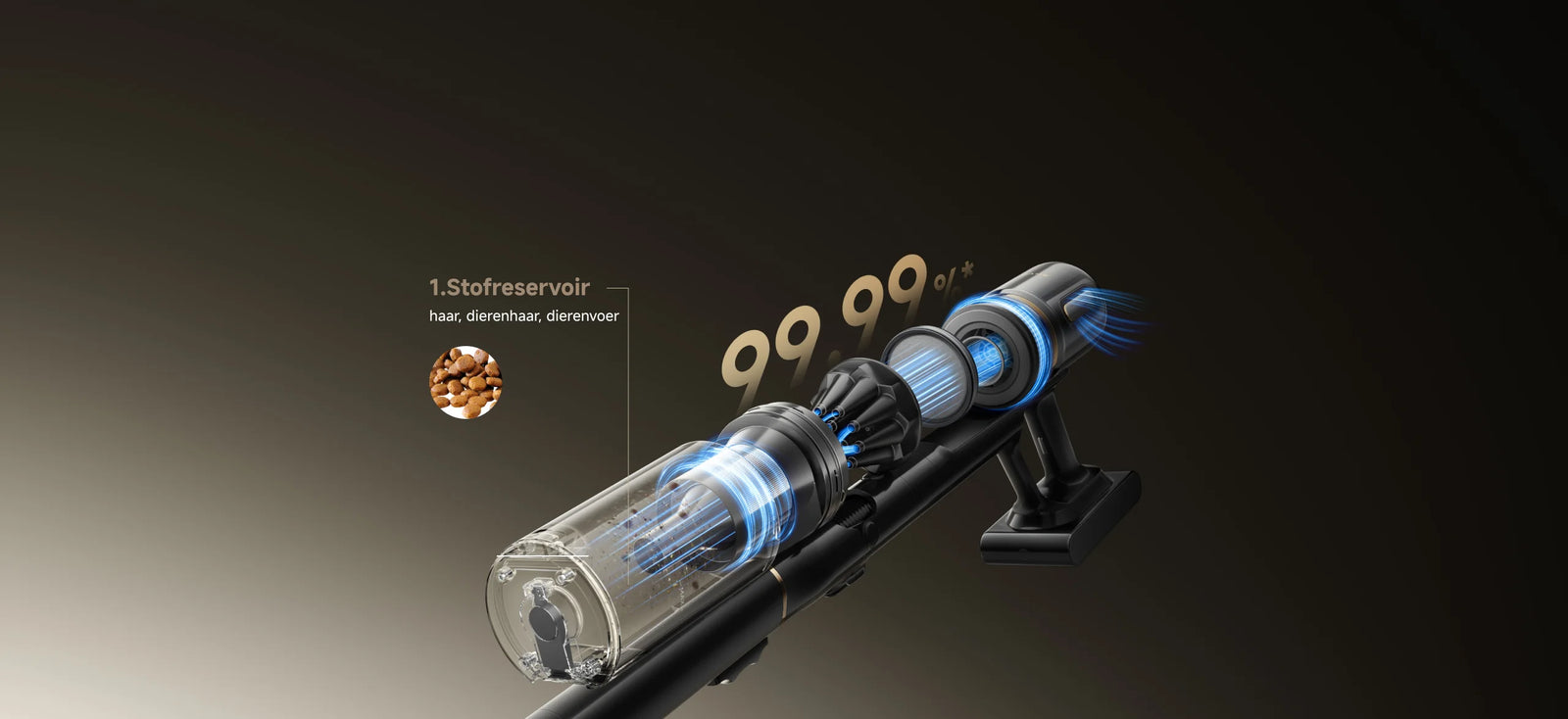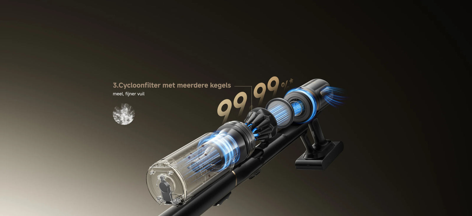 Geavanceerde cycloontechnologie genereert een krachtige centrifugale kracht om stof efficiënt af te scheiden en verstopping van het filter te voorkomen. Zo wordt van begin tot eind een consistente, vlekkeloze zuigkracht gegarandeerd.