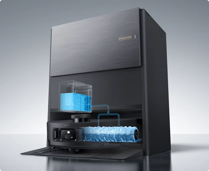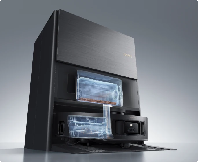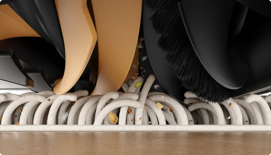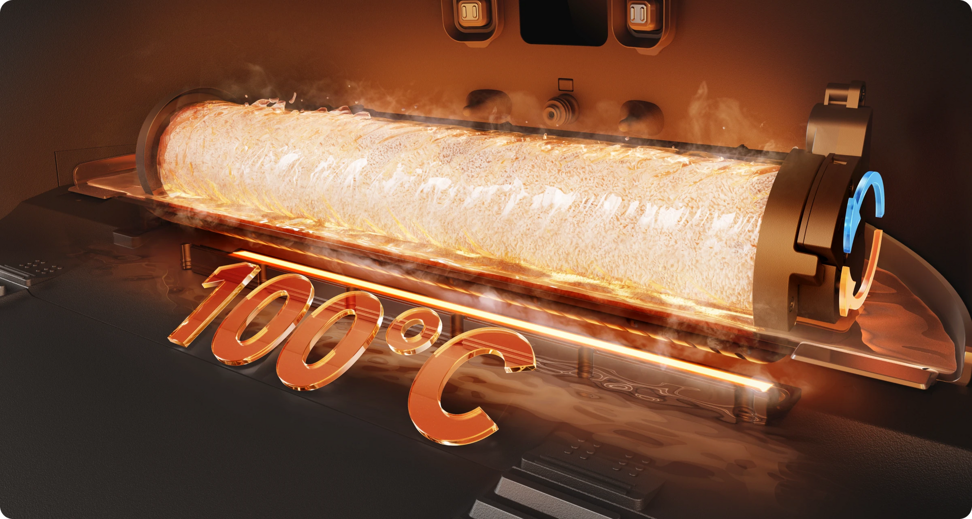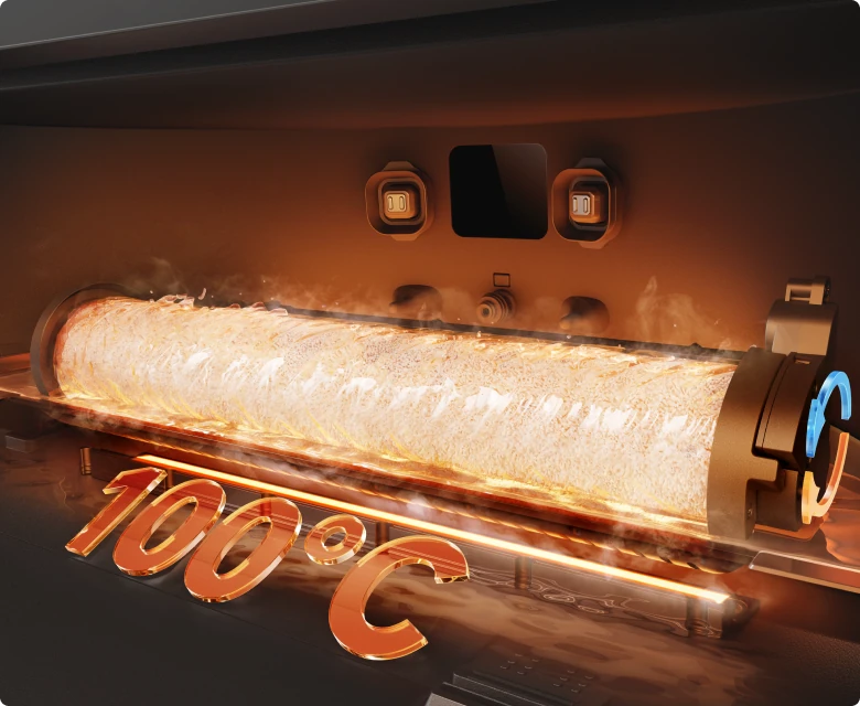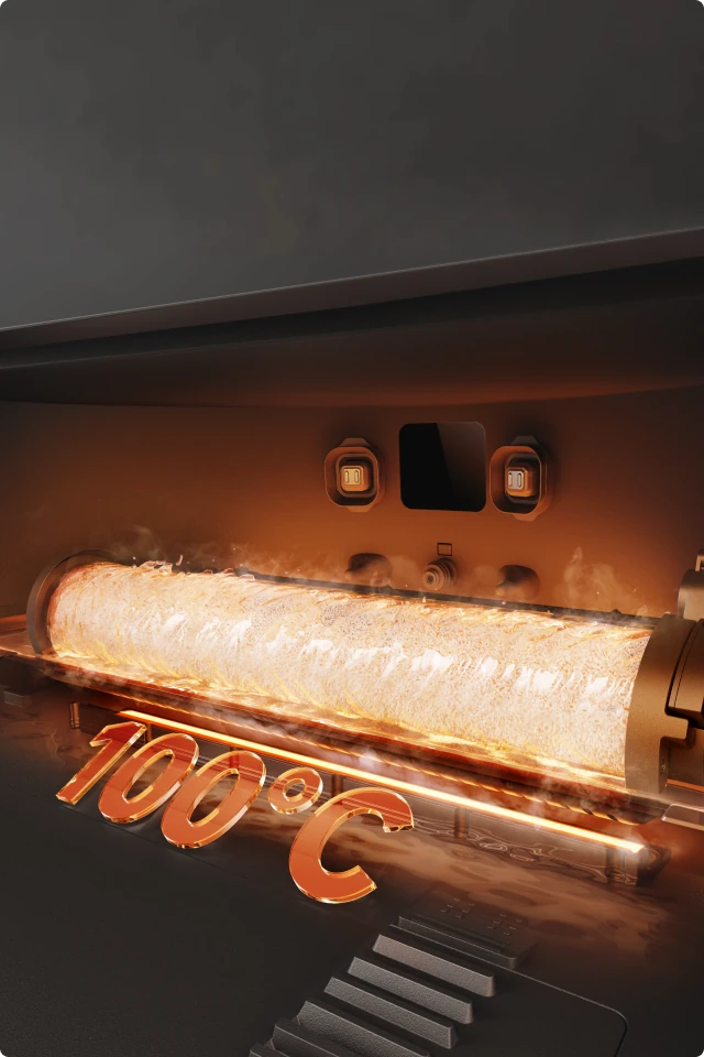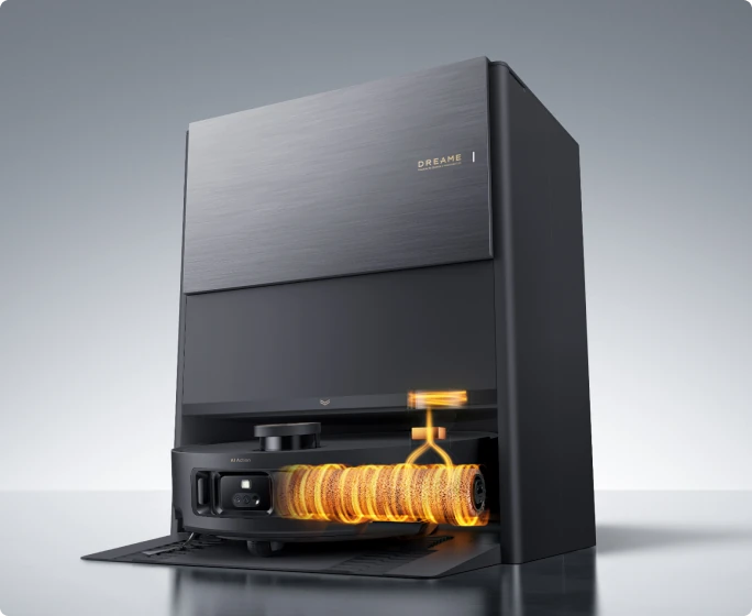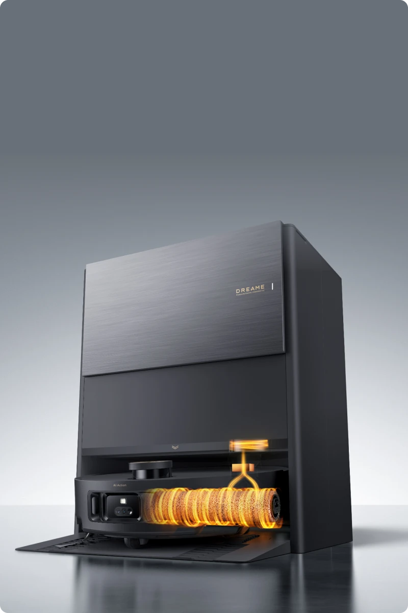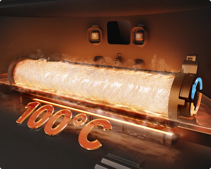 De stofzuiger geeft zichzelf na elke reinigingssessie een 'heet bad' dankzij de zelfreinigingstechnologie voor de ThermoHub™ Roller op 100 °C. De stofzuiger draait naar voren en naar achteren in het basisstation, verwijdert zware vlekken en neutraliseert geurtjes in de roldweil.