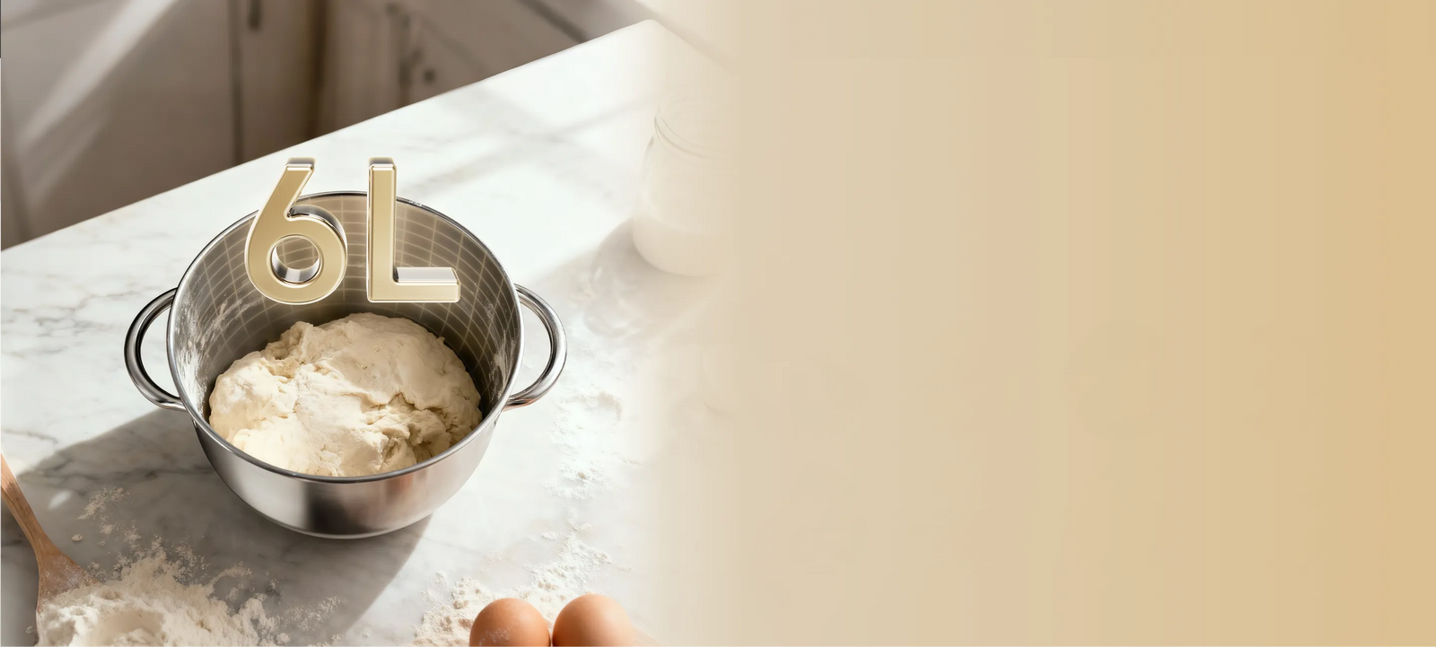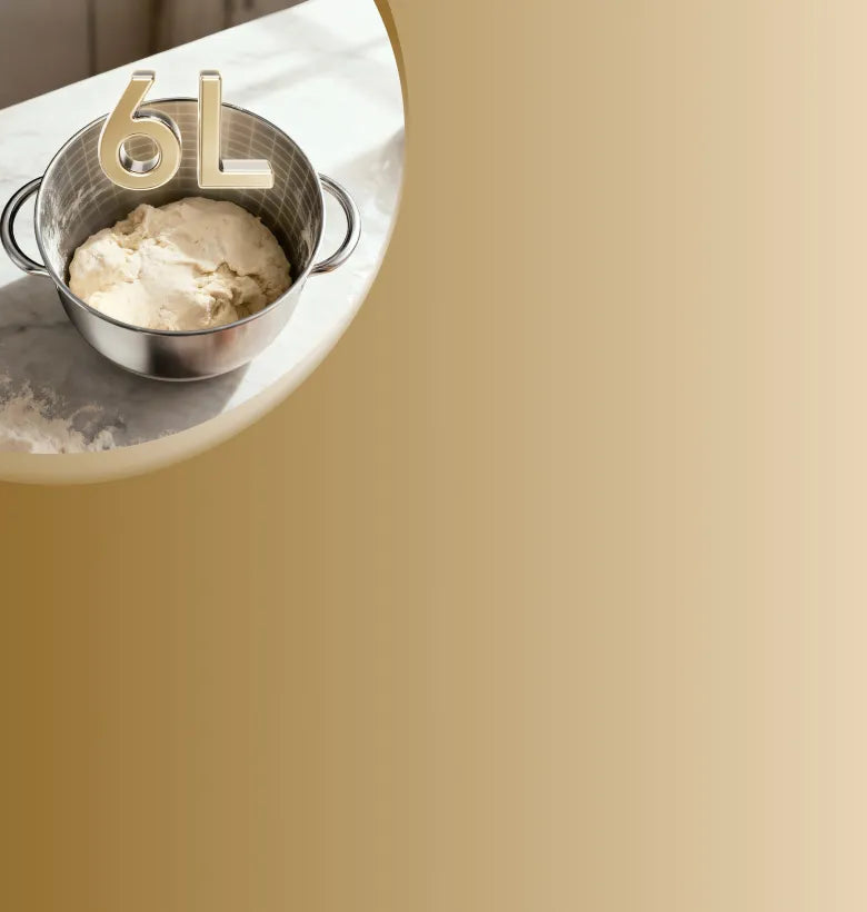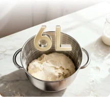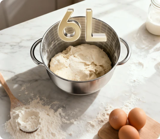 De capaciteit van 6 L verwerkt tot 1,5 kg bloem en voldoet moeiteloos aan de behoeften van grote gezinnen of het bereiden van porties voor bijeenkomsten.