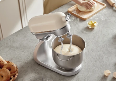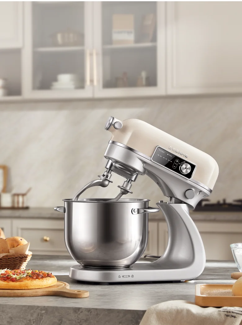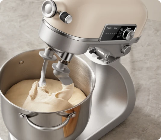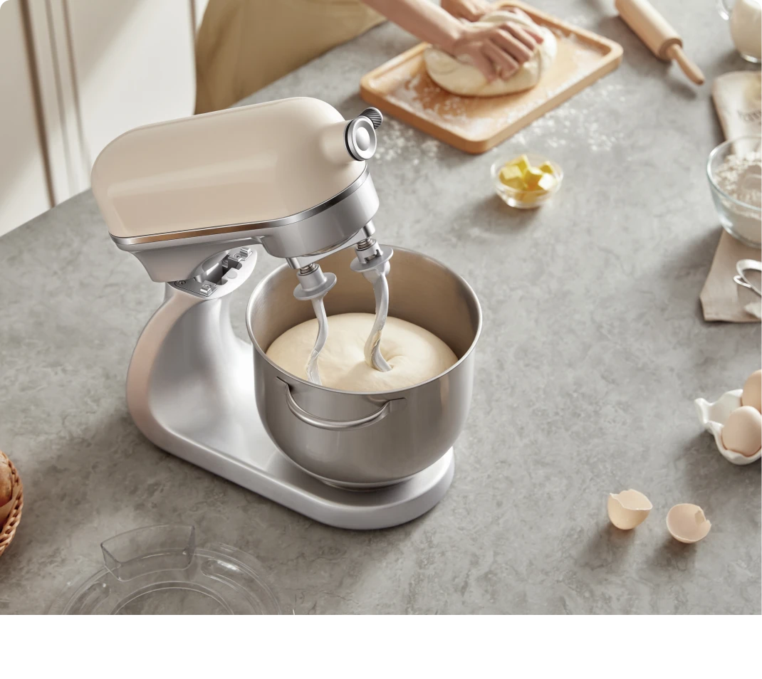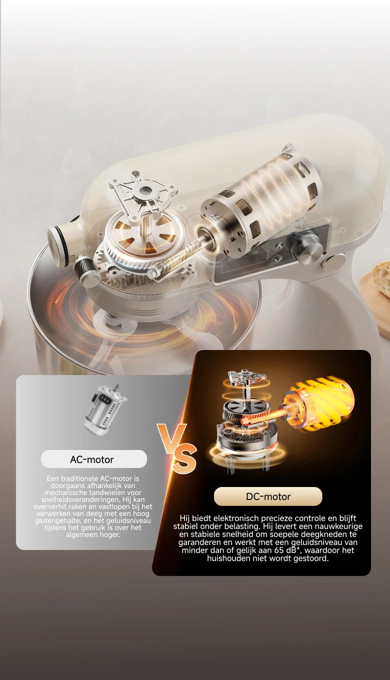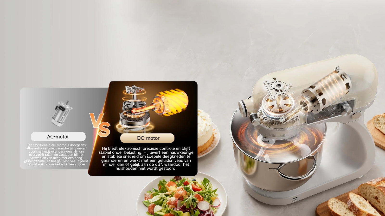 De 800 W krachtige DC-motor verwerkt moeiteloos deeg met een hoog glutenpercentage met minimale geluidsoverlast, waardoor het rustig blijft in huis.