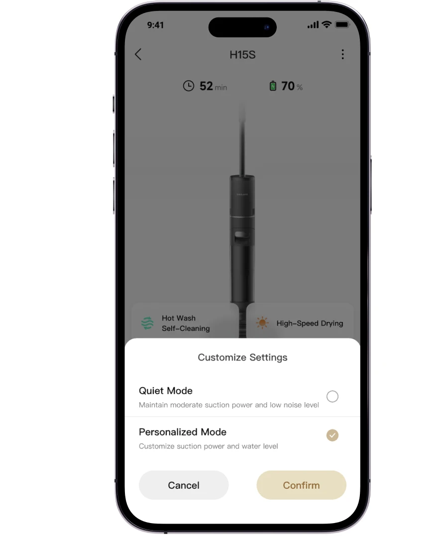 H15S behoudt een zuigkracht van 21.000 Pa*, zelfs wanneer deze volledig plat is gelegd, terwijl de vuilwatertank wordt vergrendeld om de motor te beschermen tegen schade door terugstroming.