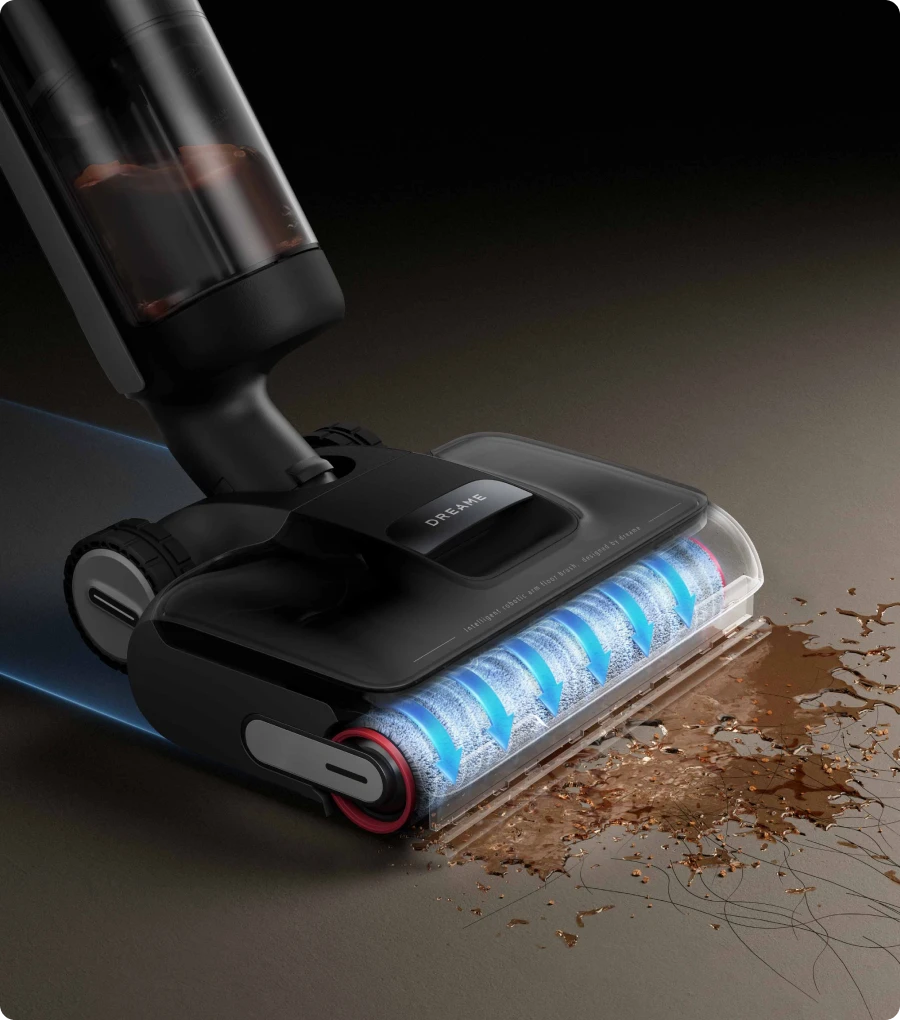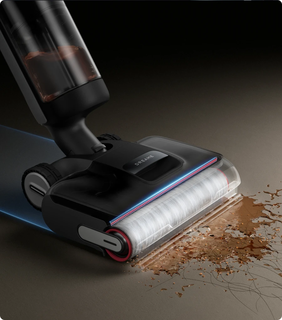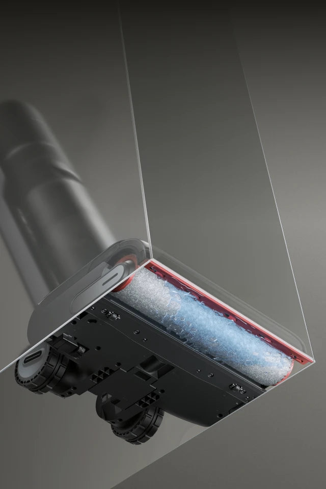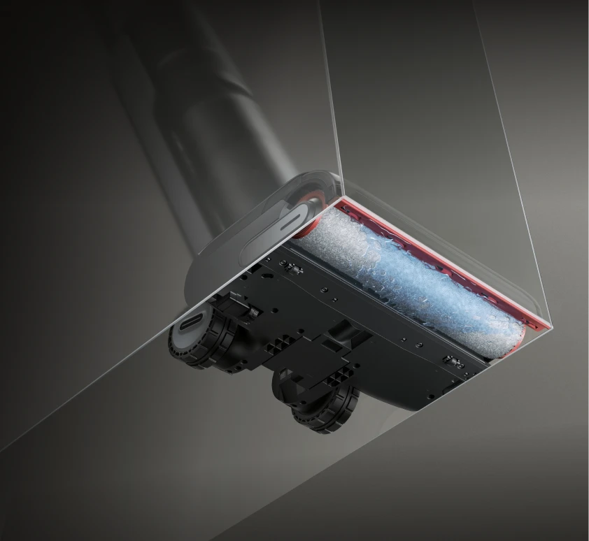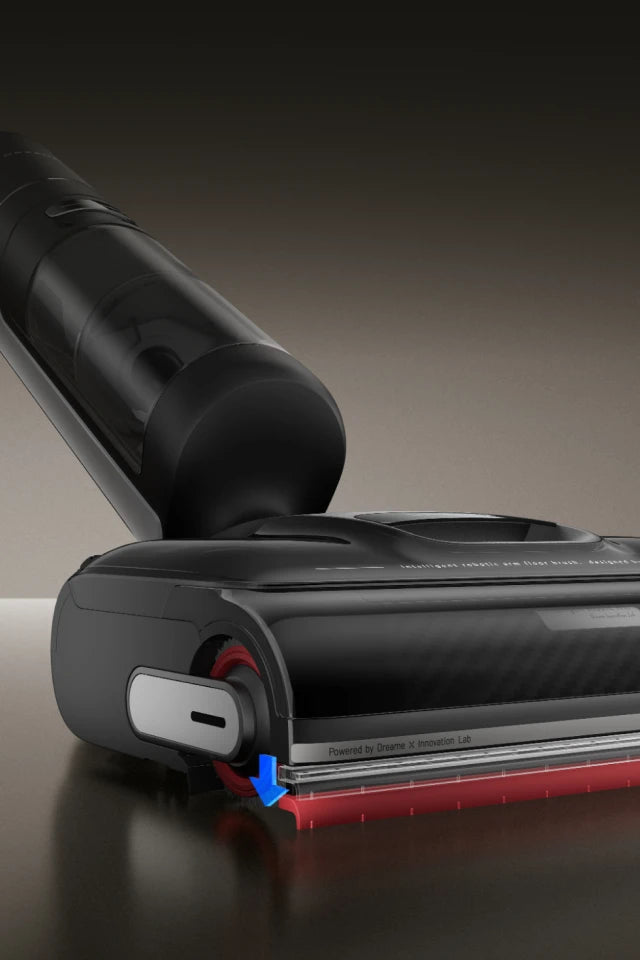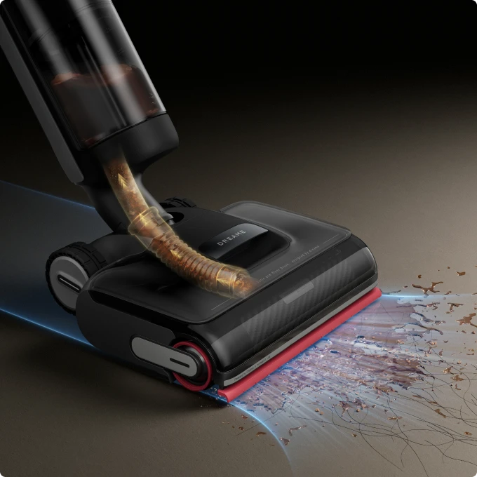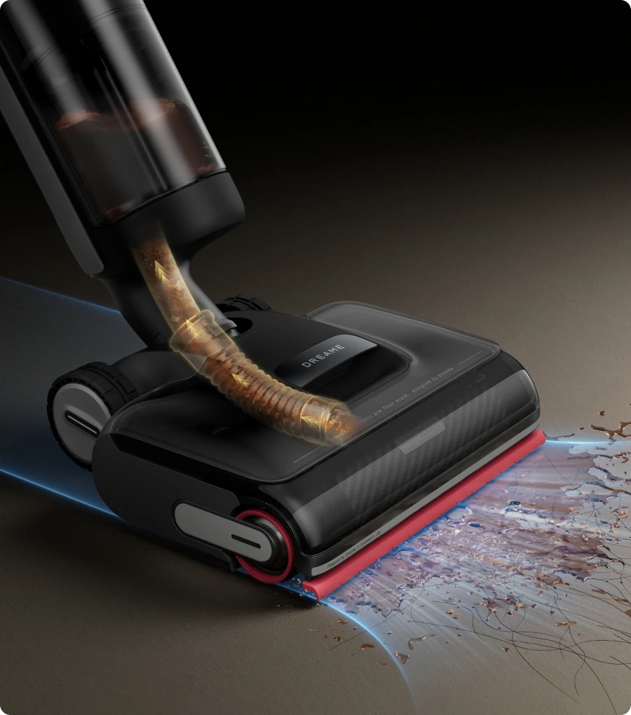 Terwijl u de stofzuiger naar achteren trekt, drukt de robotarm stevig tegen de vloer om achtergebleven nat en droog vuil eenvoudig te verwijderen.