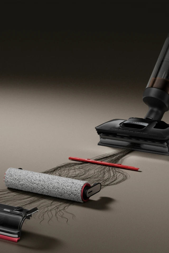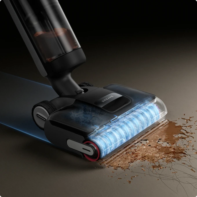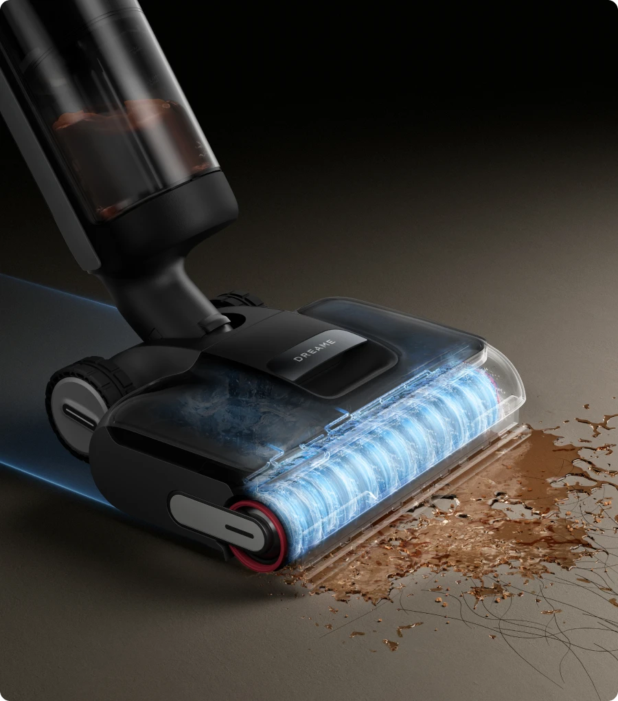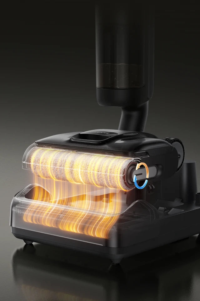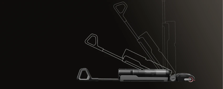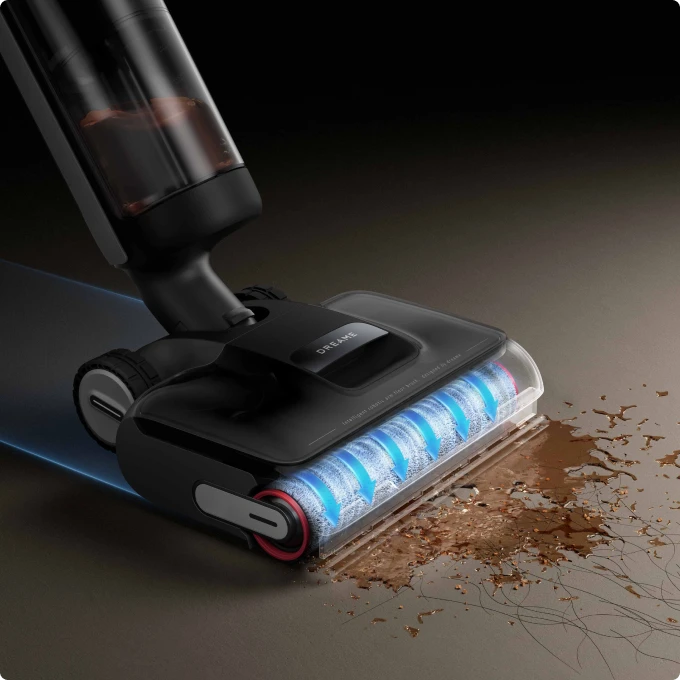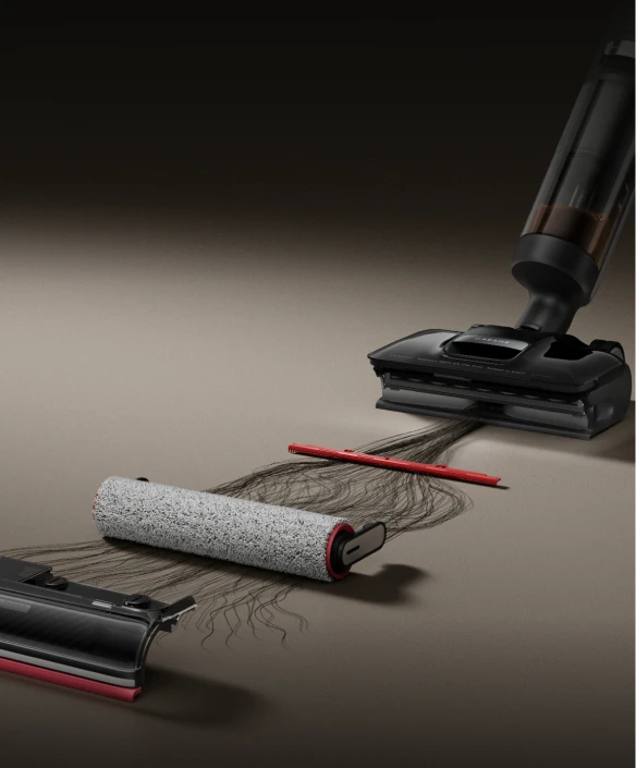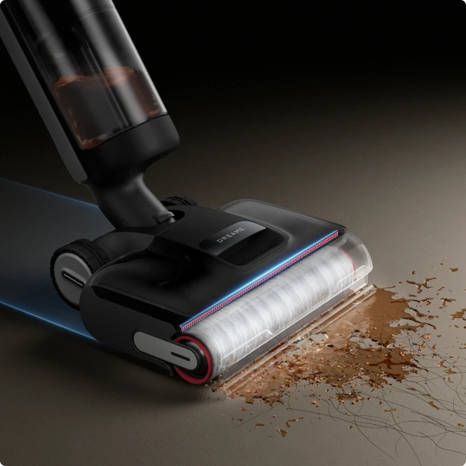 Terwijl u de stofzuiger naar achteren trekt, drukt de robotarm stevig tegen de vloer om achtergebleven nat en droog vuil eenvoudig te verwijderen.