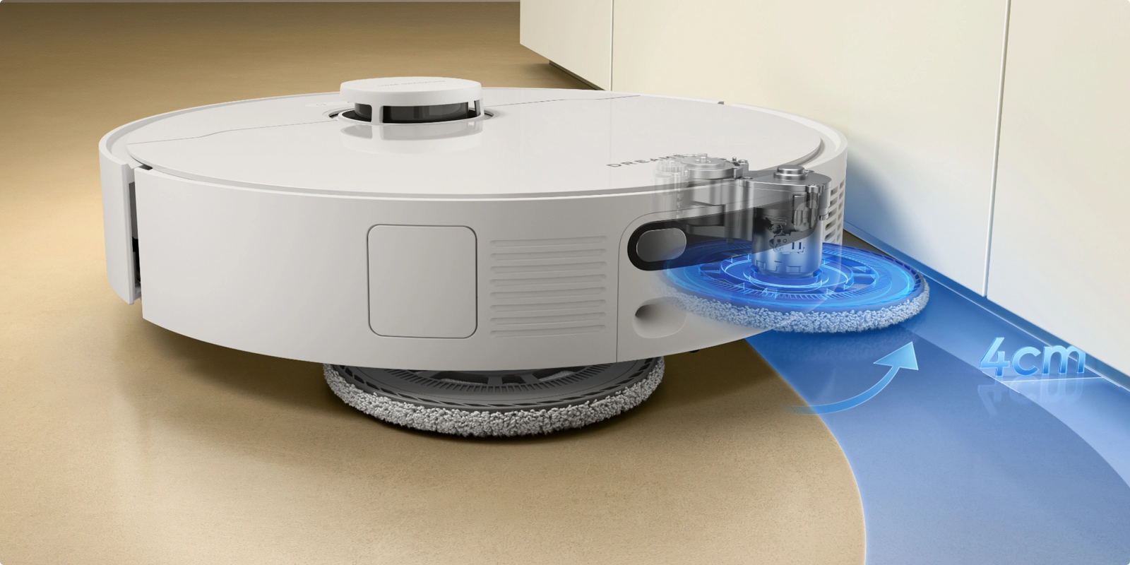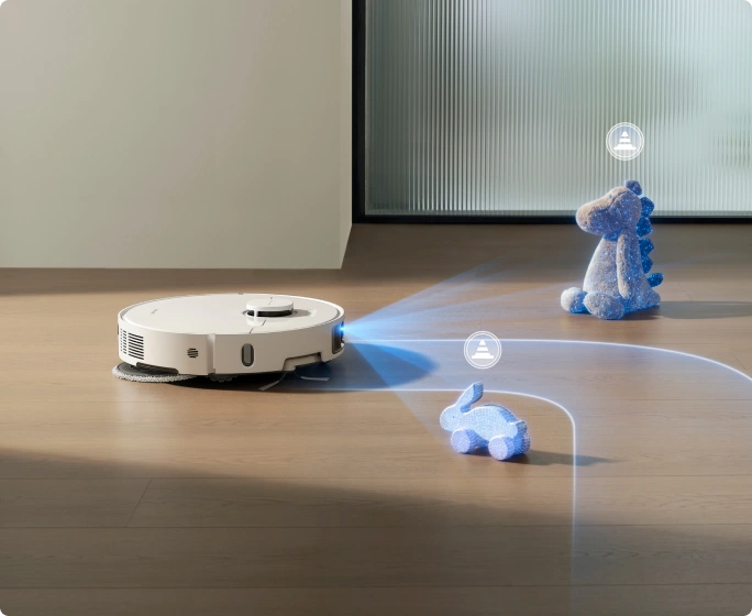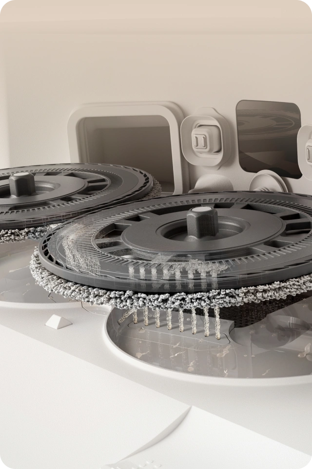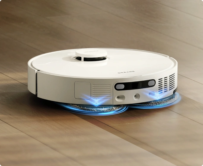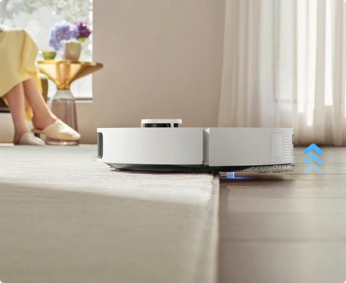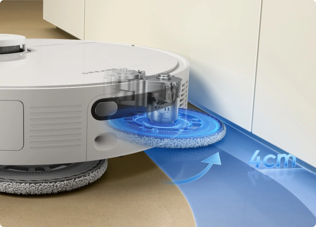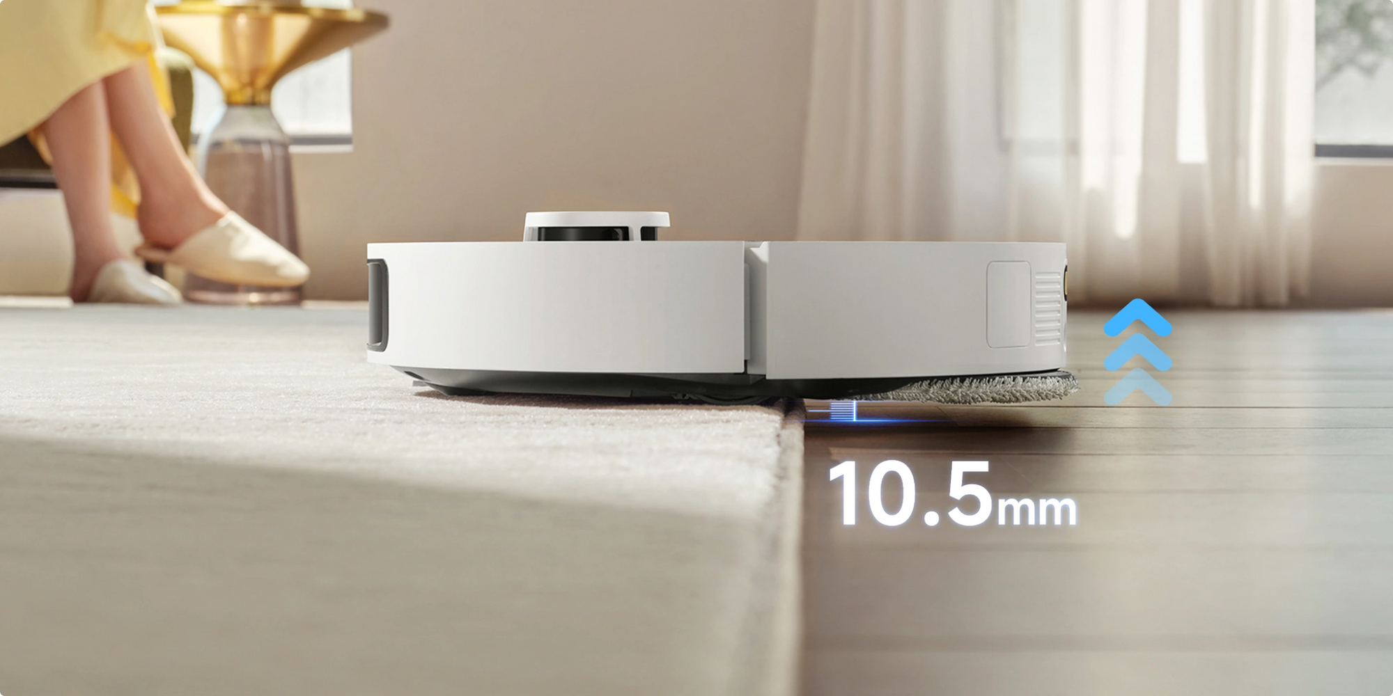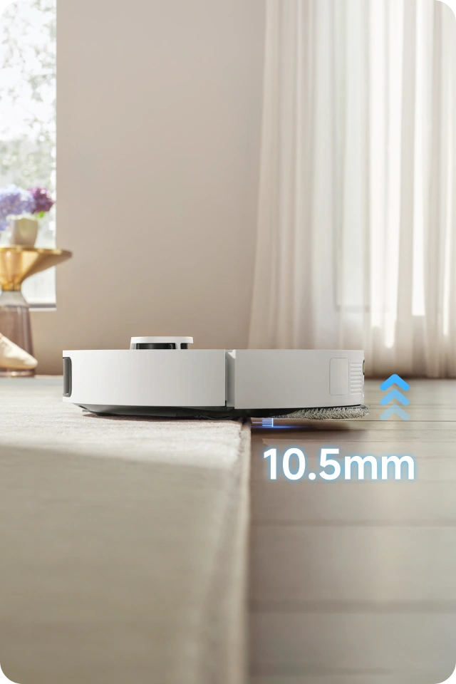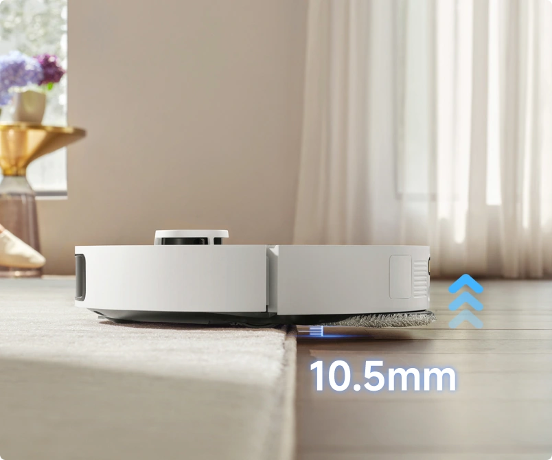 *10,5 mm: gebaseerd op onze interne labgegevens. Het hoogteverschil van de robotstofzuiger voor en na het optillen van de dweil is 10,5 mm.