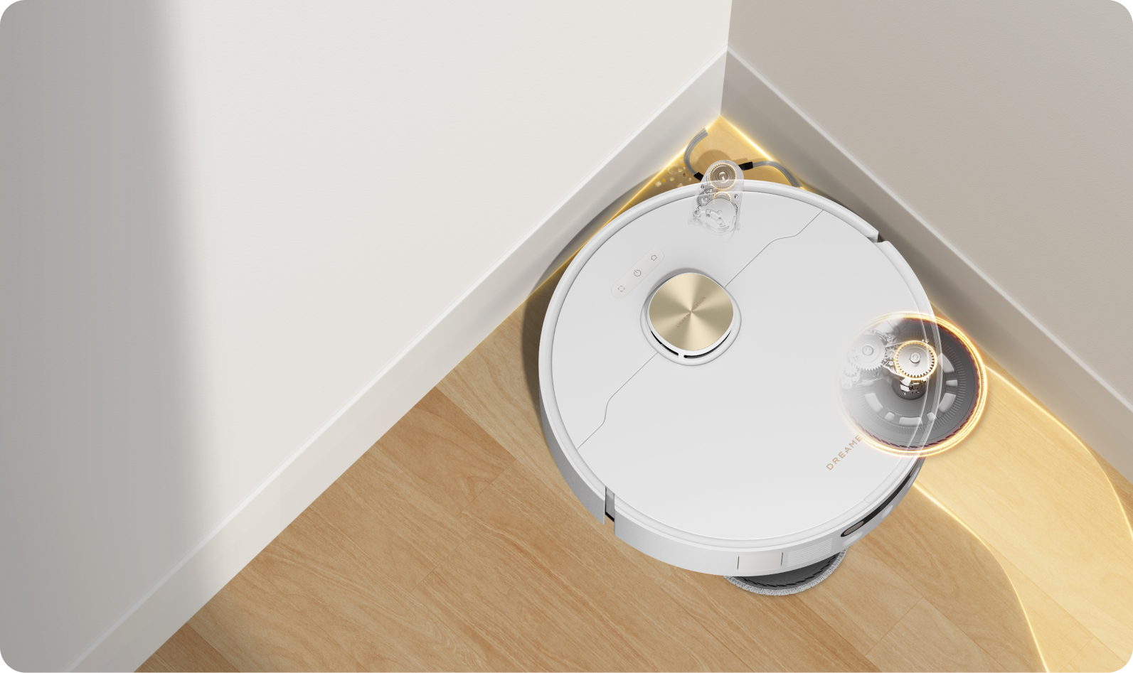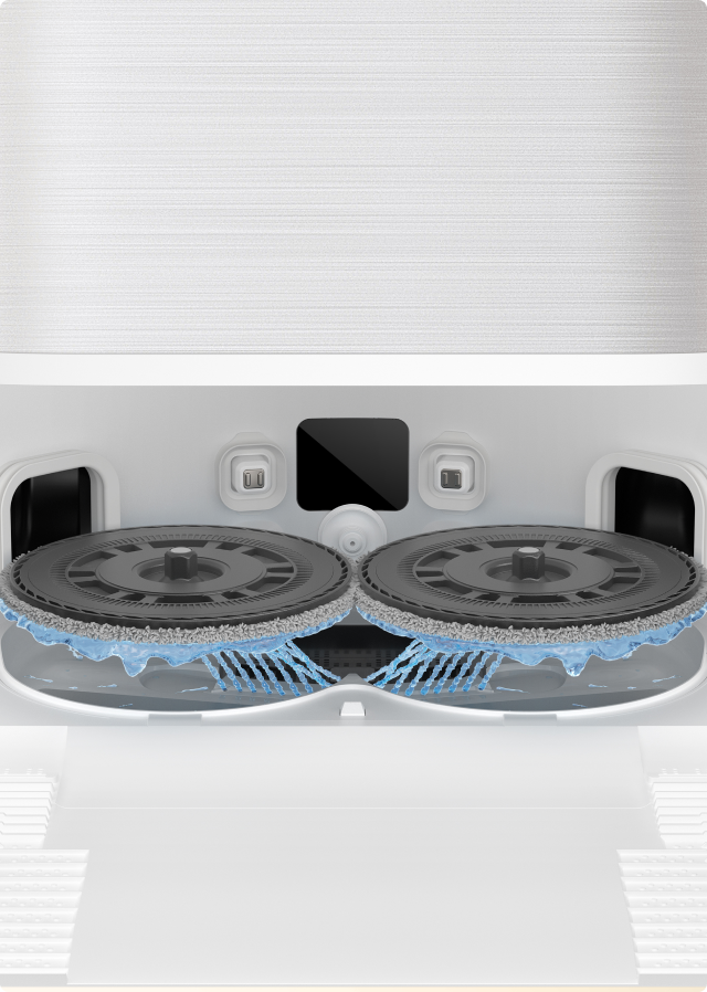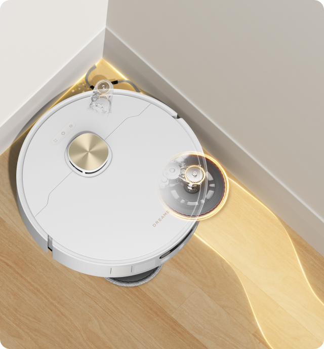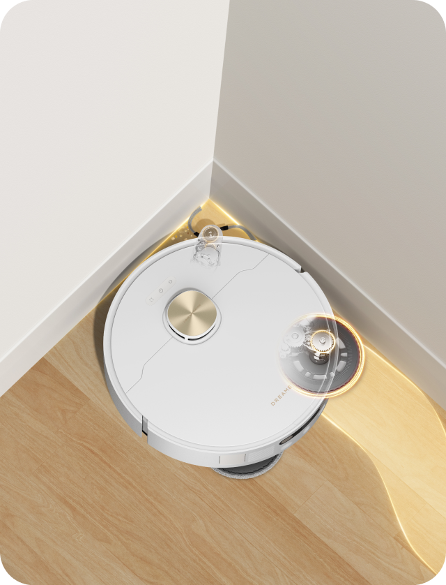 Een uitschuifbare zijborstel en draaiende dweil bereiken randen, hoeken en lage ruimtes, en reinigen langs plinten en onder meubels voor een betere dekking.