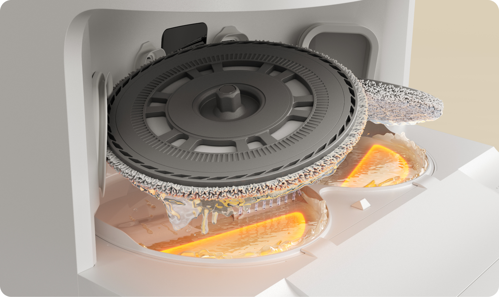 Het 100 °C warm water helpt bij het reinigen van dweilpads door vet af te breken en geurtje te verminderen, waarna het automatisch afkoelt voor veilig gebruik.