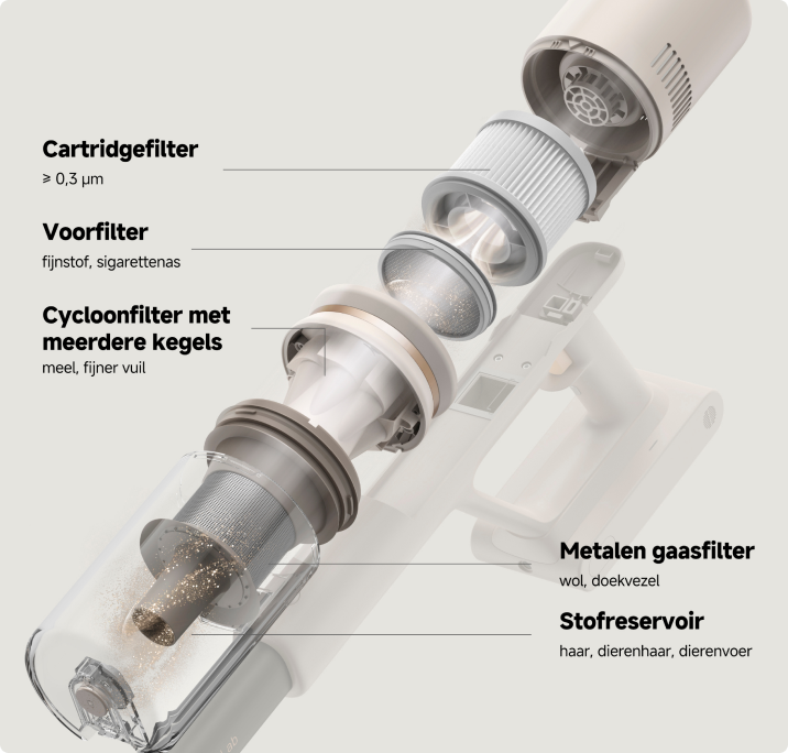 *40 minuten: gebaseerd op tests in het laboratorium van Dreame, in de Eco-modus met het combinatiehulpstuk. De werkelijke looptijd kan variëren, afhankelijk van de gebruiksomstandigheden.
