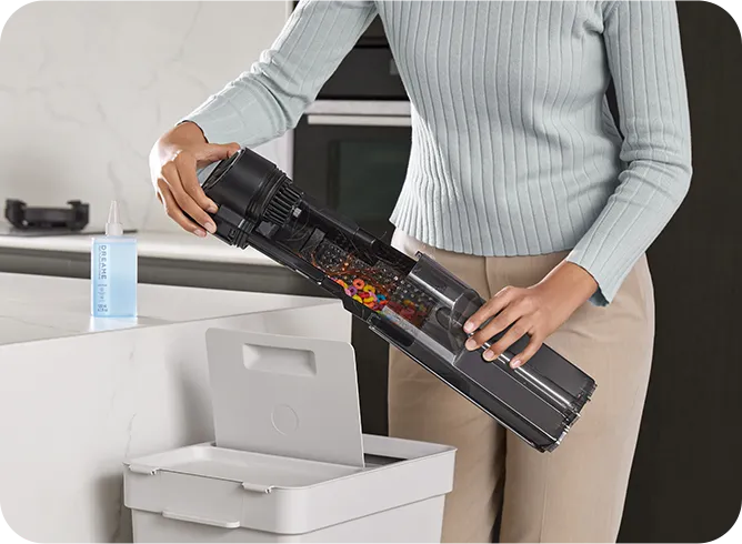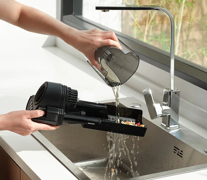 De eenvoudig te legen filterhouder scheidt vast van vloeibaar afval, waardoor de uiteindelijke reiniging snel en gemakkelijk verloopt.