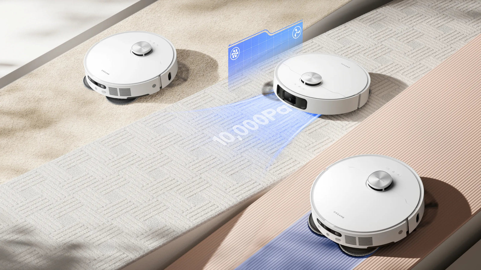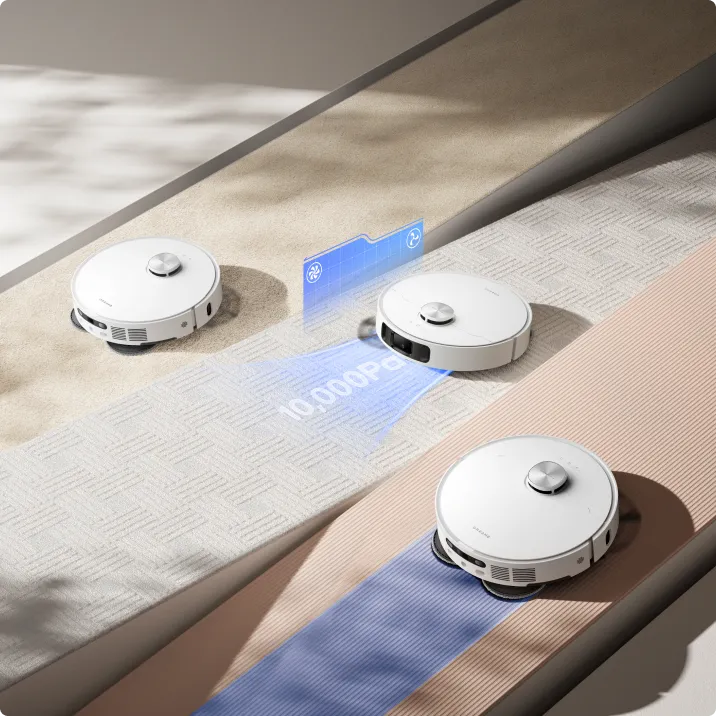 De L10s Ultra Gen 2 biedt meerdere reinigingsmodi voor tapijt: dweil omhoog, intensieve tapijtreiniging met zuigkrachtverhoging, stofzuigen en dweilen, tapijt vermijden en tapijt reinigen met prioriteit. Selecteer de optimale methode voor elk tapijt in uw huis.