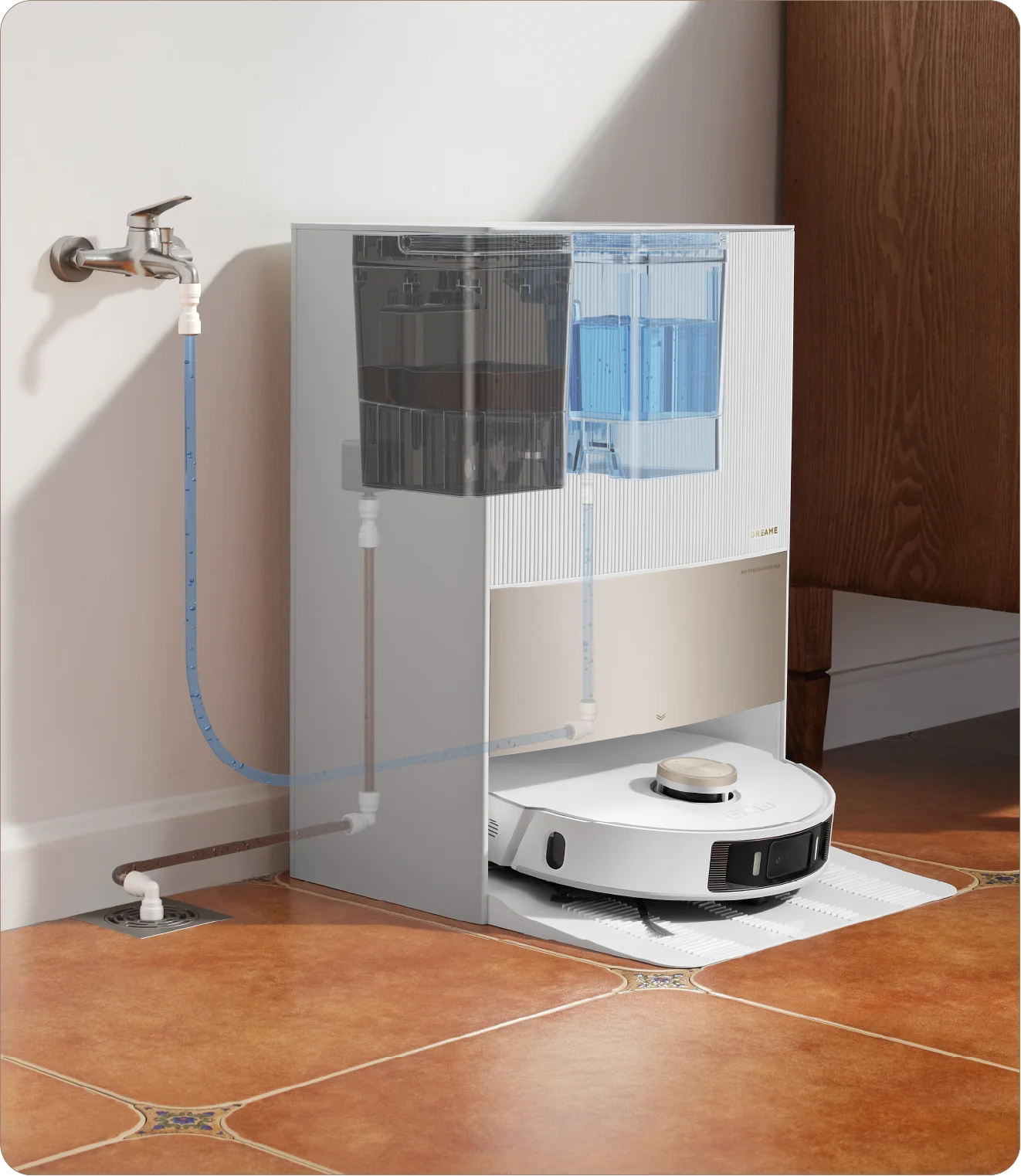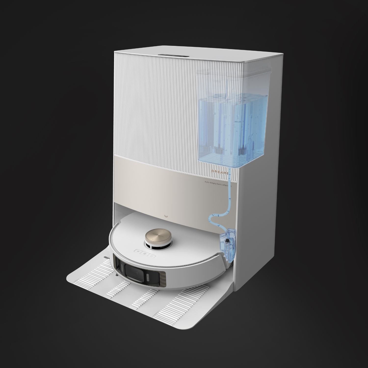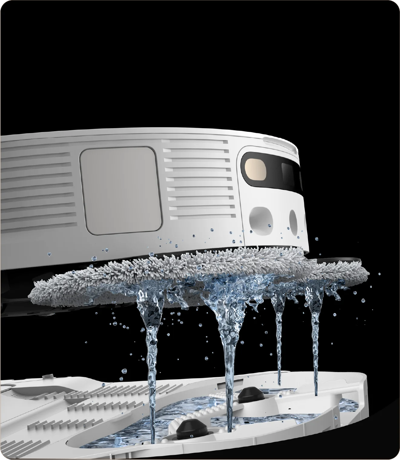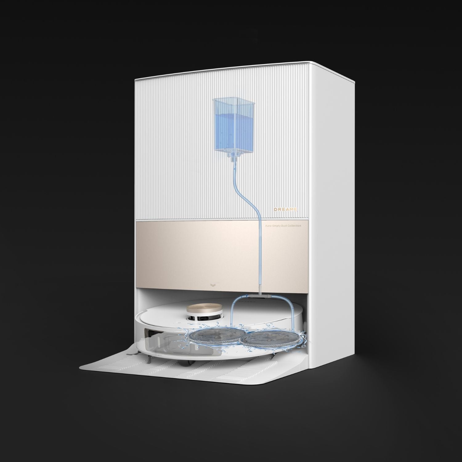 Het basisstation mengt de schoonmaakoplossing zelfstandig met water, zodat de dweilpads fris en schoon blijven zonder handmatige inspanning.