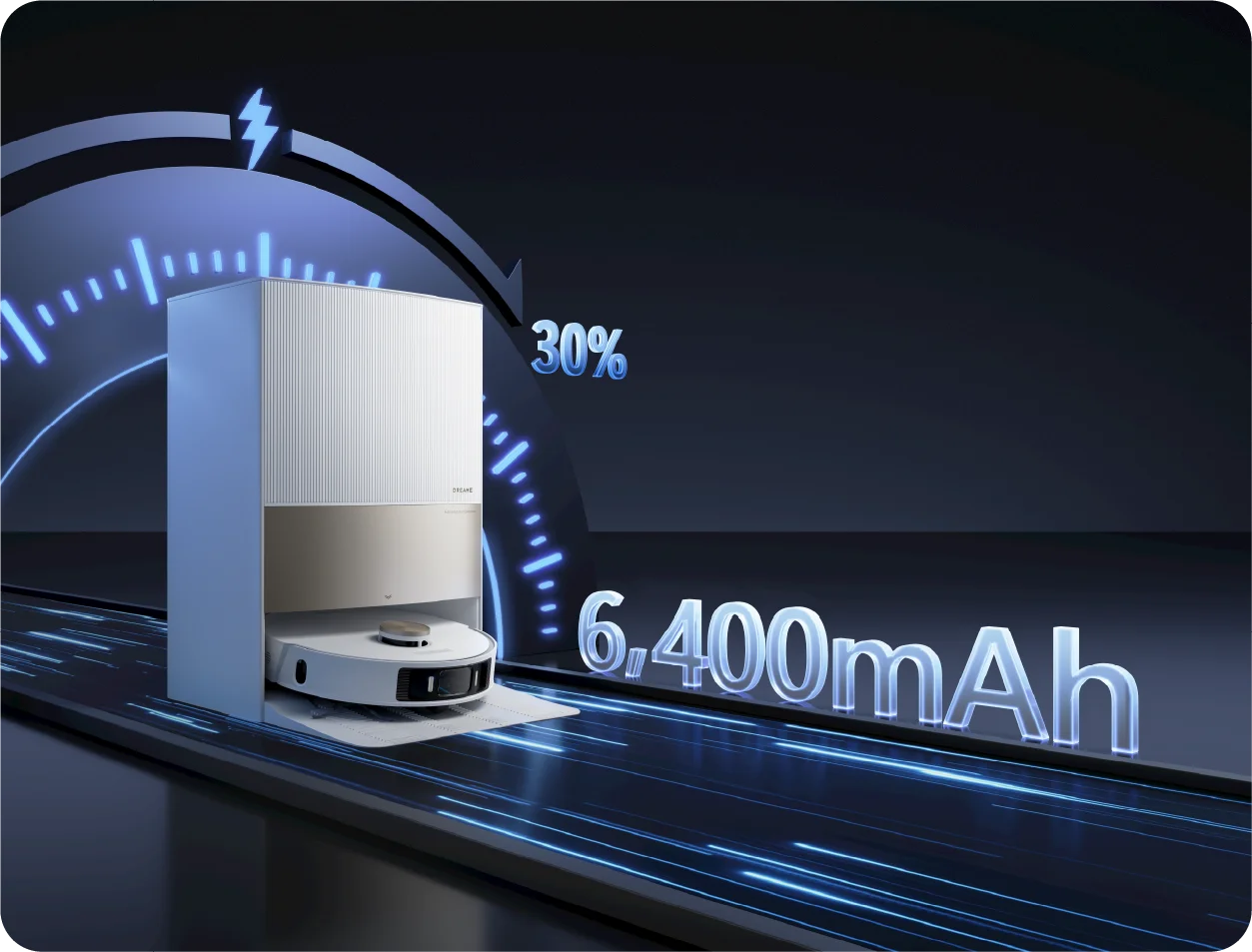 De geavanceerde technologie van Dreame verhoogt de oplaadsnelheid enorm voor de grote batterij van 6400 mAh, zodat uw robot snel klaar is voor de volgende schoonmaakbeurt.