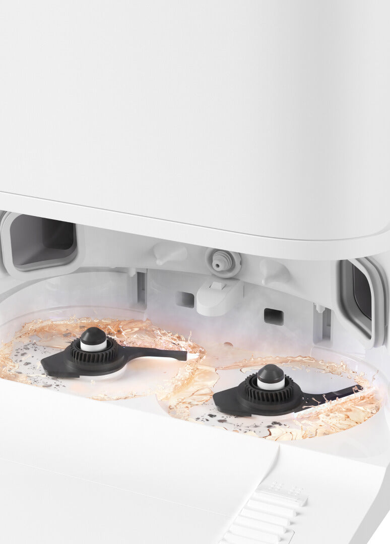 De troebelheidssensor meet hoe vuil gebruikt water is, om de dweil opnieuw te wassen en hardnekkige vlekken continu te verwijderen. Vervolgens dweilt de L40 Ultra de vloer nogmaals, waardoor deze fris en glanzend blijft.