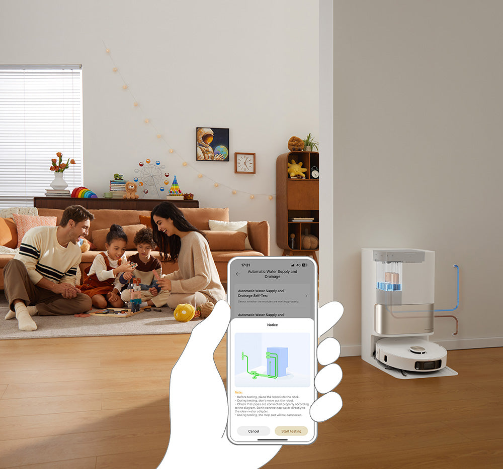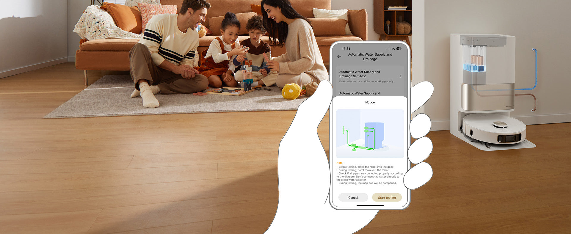 Met behulp van de zelftest van de kit voor wateraansluiting in de functies van de app kan ons apparaat een eventueel probleem tijdig opsporen, waardoor de robot eenvoudig en gemakkelijk weer is te gebruiken.